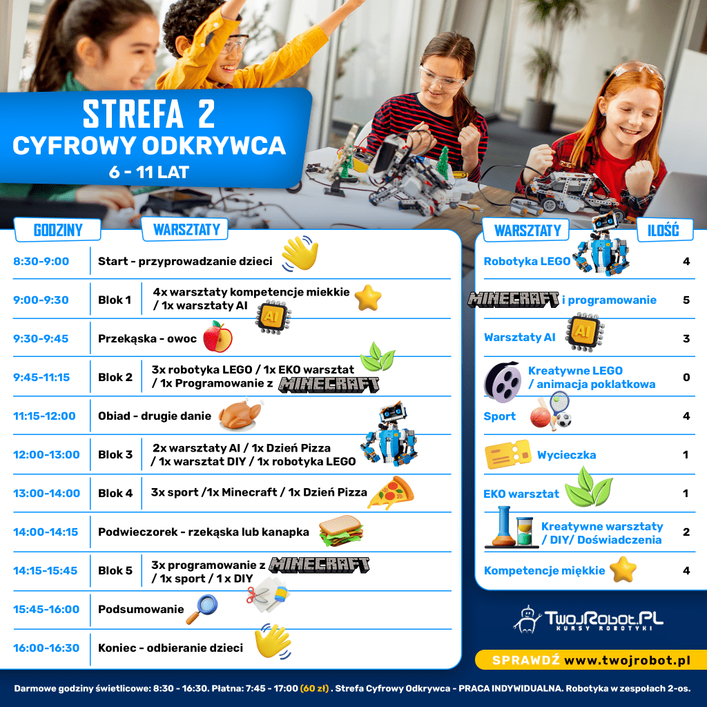 • Cyfrowy Odkrywca (8–13 lat) – LEGO® robotyka, Minecraft + programowanie, własne mini-projekty z AI. Półkolonie dla fanów LEGO, robotów i Minecrafta!
